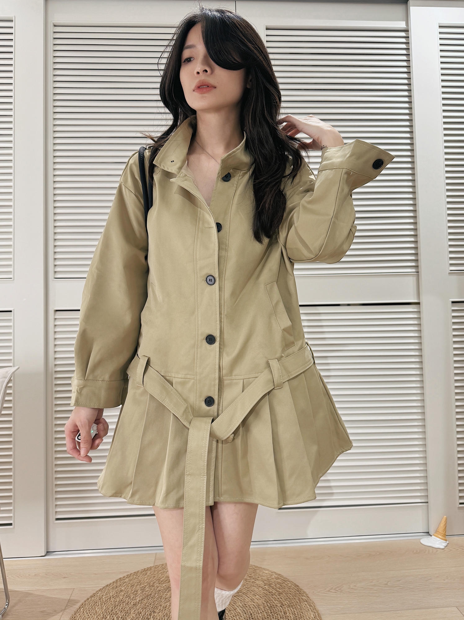 以短版百摺洋裝剪裁結合風衣結構,