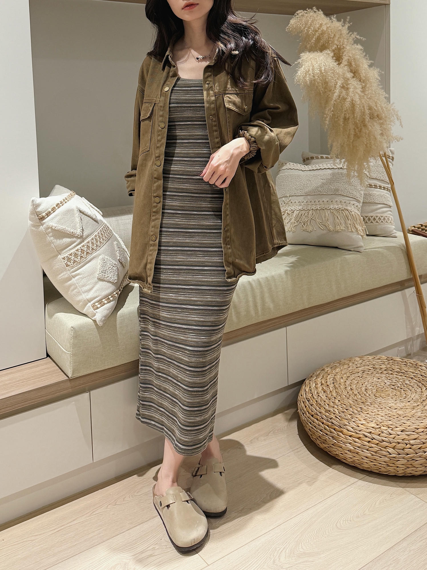 ・配色:橄欖灰 × 米 × 深灰條紋層次