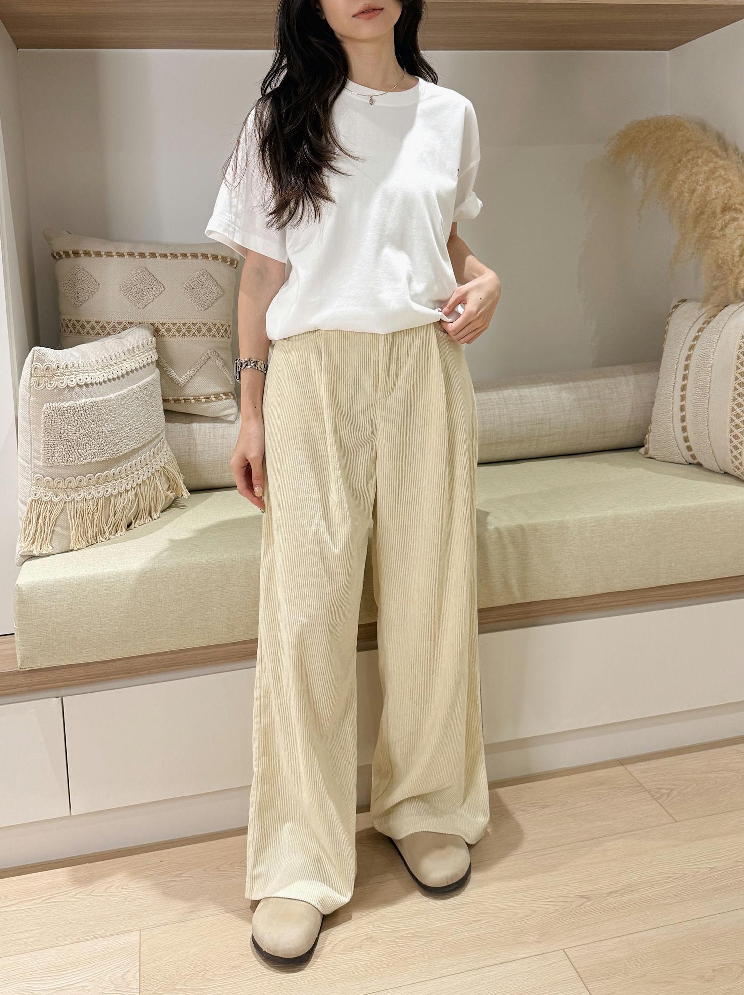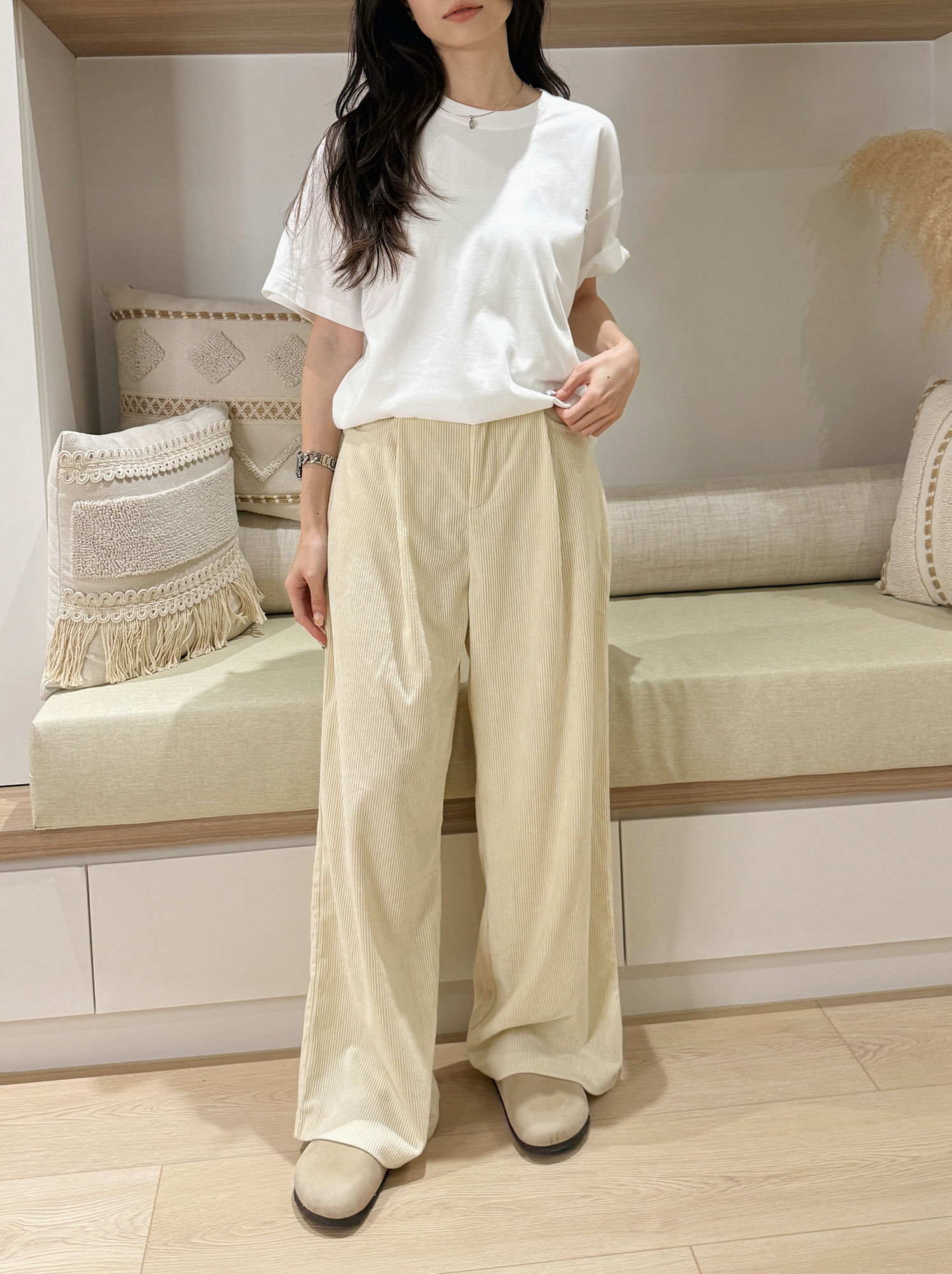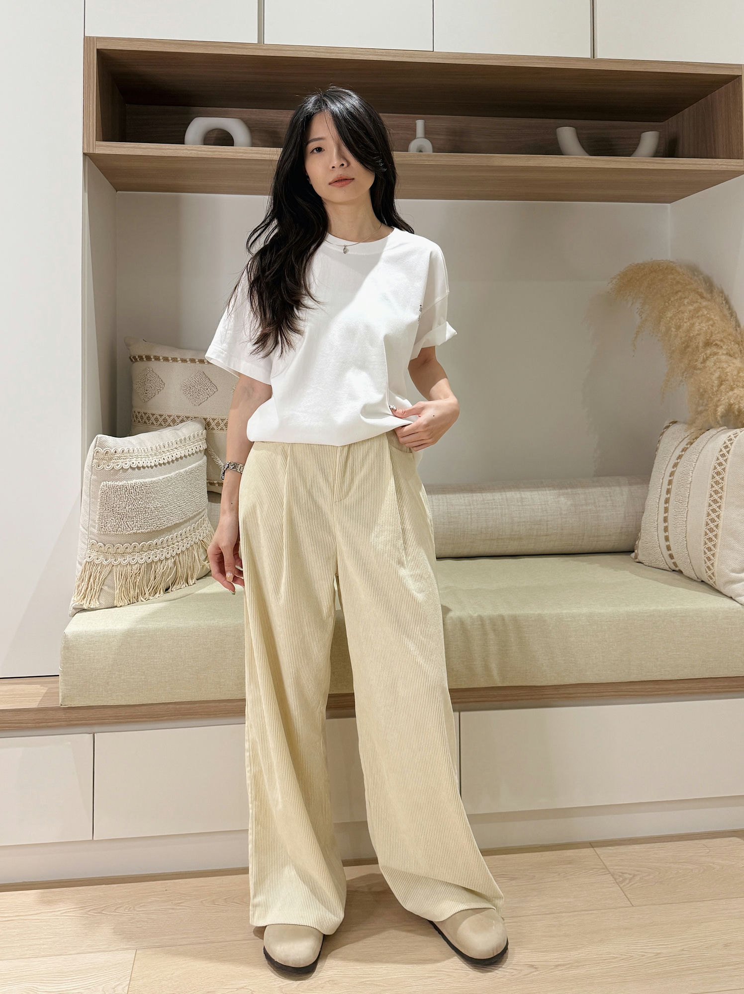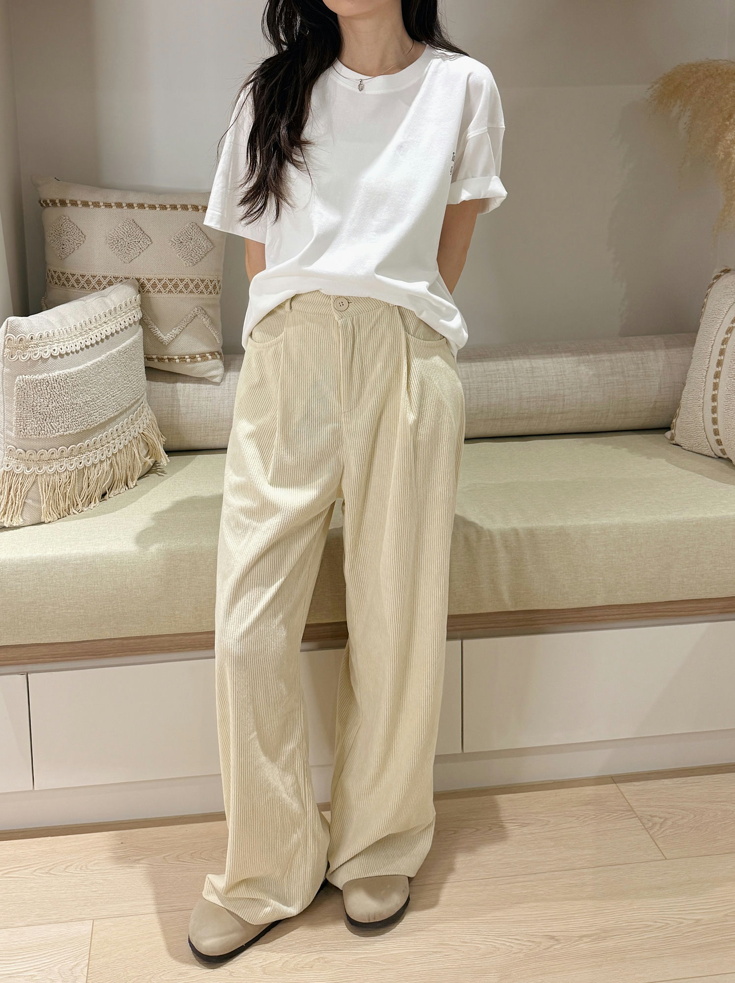 這件奶油色燈芯絨直筒寬褲,