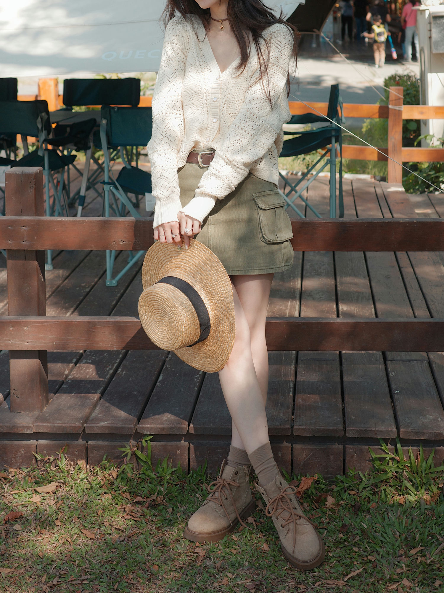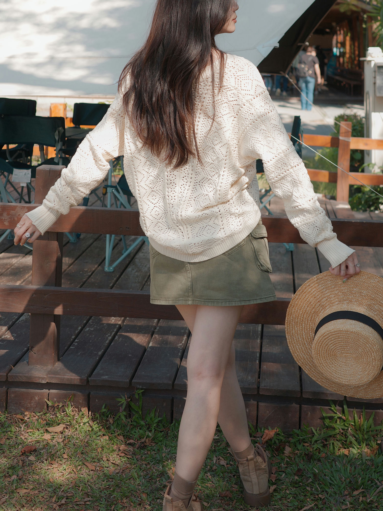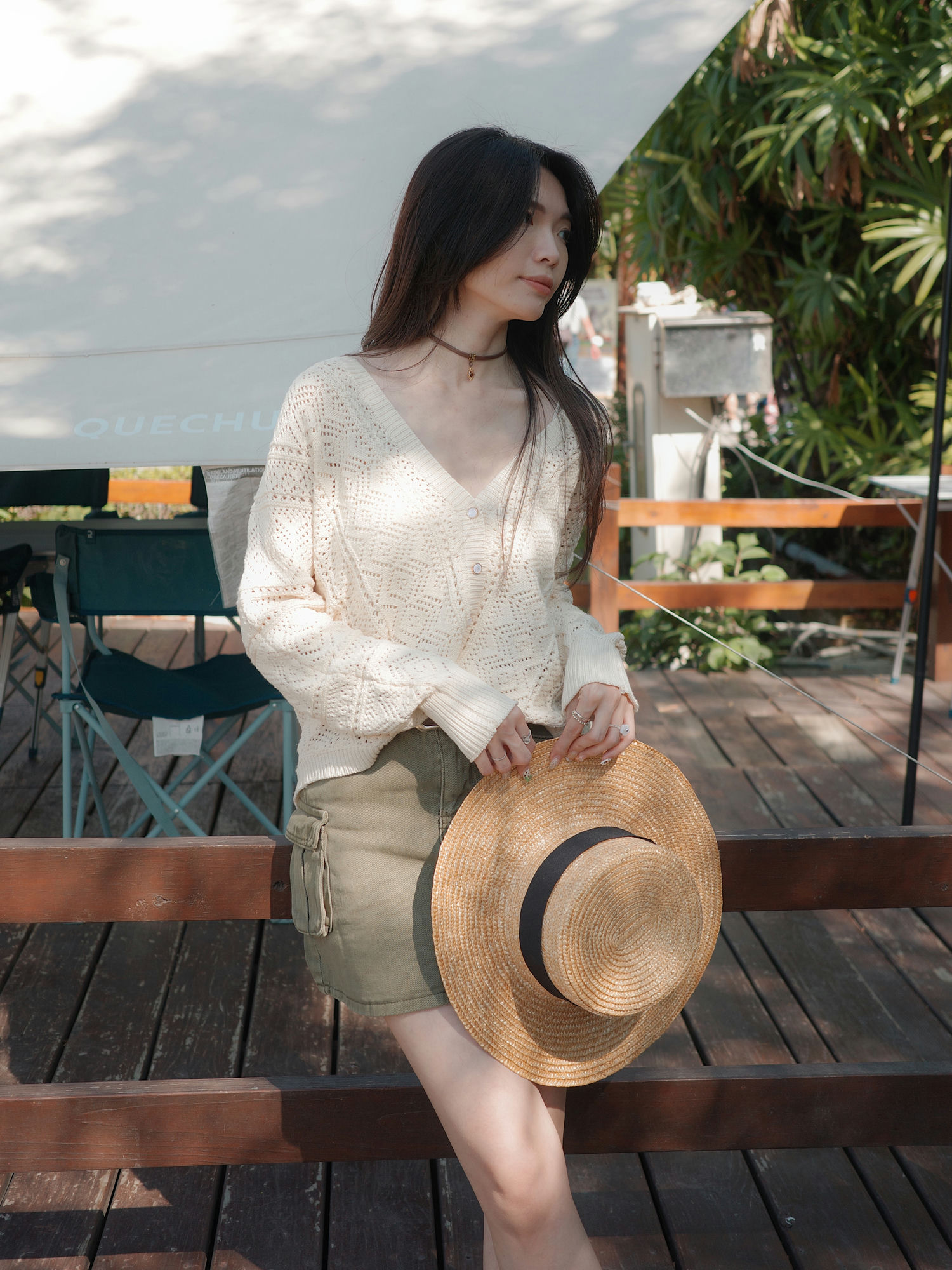 A:鏤空設計會微透,建議內搭小可愛或背心更好看~